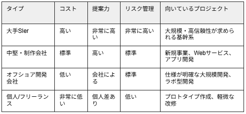 大手SIerは高い品質と安心感がありますが、管理費などの間接コストが上乗せされるため、費用は高くなります。中小ベンダーや制作会社は、柔軟な対応が可能でコストパフォーマンスに優れている傾向があります。
