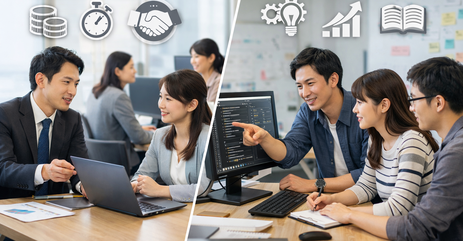 自社スタッフが企画やマーケティングといった事業戦略に注力し、実装をプロに委ねる体制は、事業成長を加速させる強力な原動力となります。エンジニアの評価制度策定や離職防止といった、工数のかかるマネジメント業務から解放される点も見逃せません。